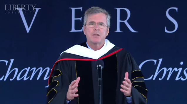 上周六,共和党准总统候选人杰布·布什(Jeb Bush)在维吉尼亚社会自由大学毕业典礼上演讲上重申基督教的地位与价值。