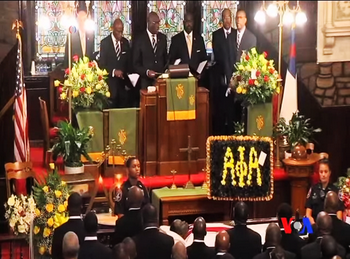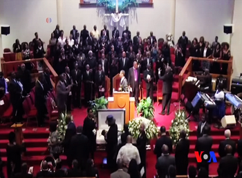 26日,美国南卡罗来纳州民众为黑人教堂枪击案遇难牧师举行葬礼。总统奥巴马及其夫人米歇尔,副总统拜登,国会众议长博纳等国会议员,美国前国务卿希拉里等大约6000人出席了这一葬礼。奥巴马致悼词,再次呼吁美国各界采取行动应对种族歧视和枪支暴力问题。