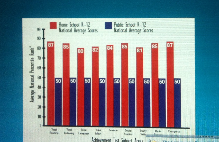 图为美国一个关于在家上学与公立学校成绩的对比,红色为在家上学12年级学生的全国平均成绩,蓝色为同等的公立学校的学生的全国平均成绩。