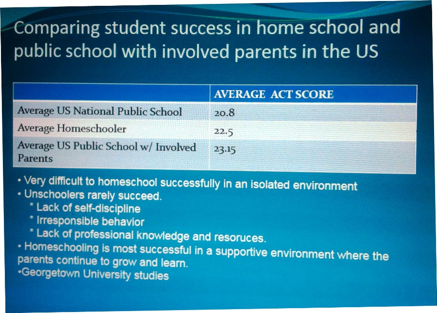 她说,人们提到在家教育时一个误区是往往认为在家教育出来的孩子学业成绩更好,她拿出美国曾经一个在家教育和公立学校两组孩子的成绩对比研究表明,在家教育的优势明显,但她又拿出一个三组的数据对比:一组是公立教育孩子的成绩;一组是在家教育孩子的成绩;一组是公立教育+父母密切关注的孩子的成绩。数据显示,的确在家教育的孩子成绩比公立教育的明显好得多,但最后一组孩子的成绩比前两者更好。怡文老师提醒说,“即使是公立教育,如果父母严肃地投入时间和关心在孩子身上,效果不会一样,我们的一个误区是以为只要离开目前的教育系统,就能解决孩子所有的学习问题,但外在的形式不是最重要的,最根本在于父母承担起自己的责任,父母的参与是关键。”
