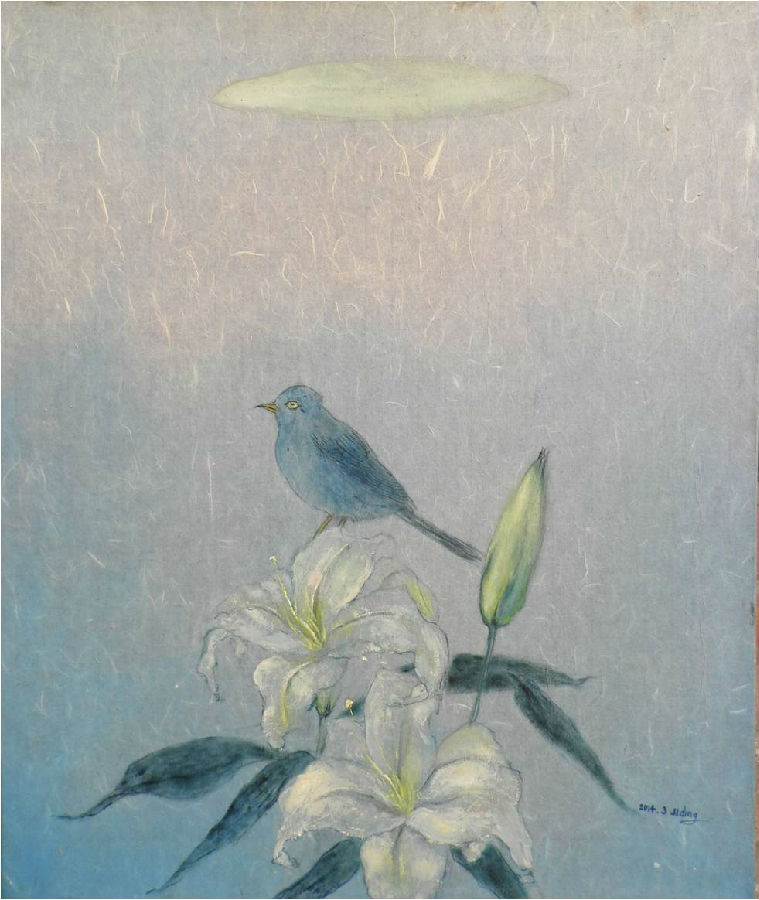 另外,还有一副《飞鸟和百合》也是王思丁这个时期的代表作之一,这总是提醒她想起来耶稣说的“你们看那天上的飞鸟,也不种,也不收,也不积蓄在仓里,你们的天父尚且养活它。你们不比飞鸟贵重得多吗?你们哪一个能用思虑使寿数多加一刻呢?何必为衣裳忧虑呢?你想,野地里的百合花怎么长起来。它也不劳苦,也不纺线。然而我告诉你们:就是所罗门极荣华的时候,他所穿戴的还不如这花一朵呢!”