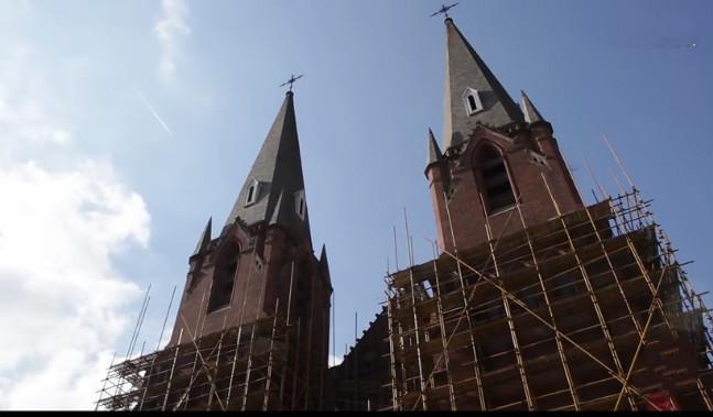徐家汇天主教堂目前室内室外修缮的现场。(图:中国日报视频截图)