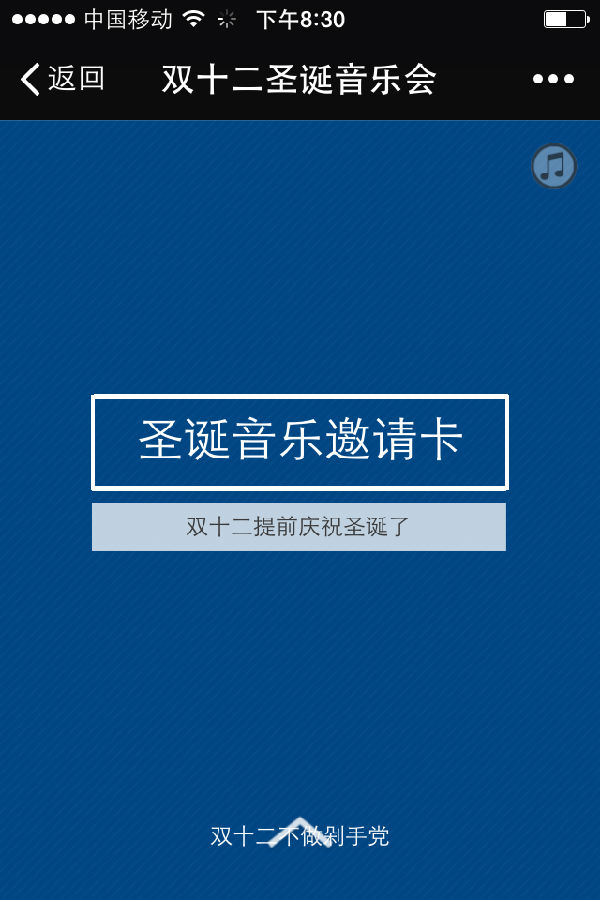 北京一间家庭教会的圣诞音乐会安排在12月11日,邀请语标题是“这个双12,不做剁手党”,打开是温馨的钢琴伴奏中展开文字“又要到圣诞节了,你想过一次不一样的圣诞节吗?还是再次在吃吃喝喝买买中过去呢?你愿否与我们一起在尹玉仲认识圣诞的真义?”随后,是对音乐会嘉宾乐队和情况的简介。