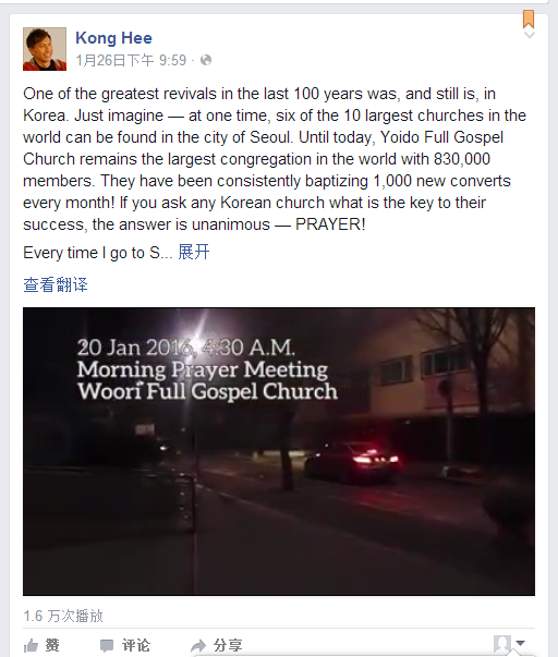 1月26日晚上9:59,新加坡城市丰收教会康希牧师在Facebook上以中英文双语分享了他参加韩国汝矣岛纯福音教会早祷会的感受,并附上现场的视频。