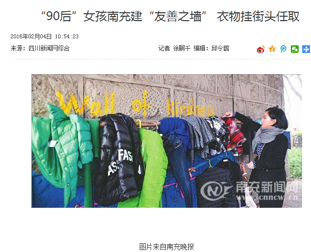 2月3日,南充也出现了这样的“友善之墙”。在嘉陵江白塔大桥下,一面蓝色的墙上用中英文写着“任何人都可以将自己多余的衣服挂在这里,而有需要的人则随时可以将它取走”字样,一件件衣服挂在墙面的竹竿上。这是一位90后女孩王靖雯的爱心之作。南充新闻网报道说,活动开展仅仅半天时间,他们就收到20多件衣服,多双鞋子,以及一些其他物品,并开始有人拿走使用,让他们感到特别欣慰并希望继续将这项爱心事业接力下去,发起人王靖雯说:“平时我们很多穿过的衣服、鞋子,旧了以后就扔掉了,现在拿来做公益,更能提高利用率,也是献爱心的表现。”