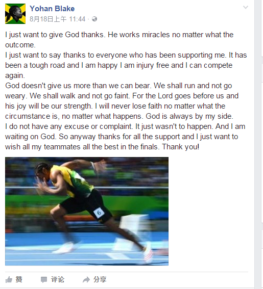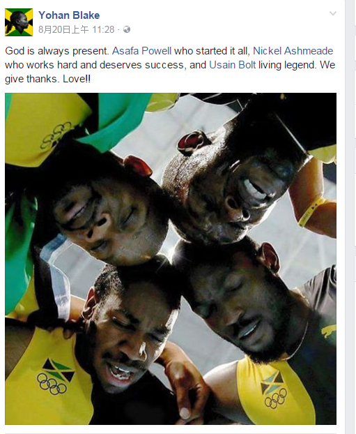 北京时间8月20日上午,里约奥运会田径男子4x100米接力决赛结束,博尔特领衔的牙买加队以37秒27的成绩夺得金牌。夺冠后,队友们一同拥抱、肩并肩的把感谢和赞美献上给神。约翰-布雷克说:“上帝一直同在....我们共同献上感谢。大爱!!”