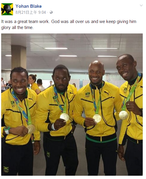 随后,他们在领金牌后,布雷克又在facebook上写到:“这是伟大的团队合作。上帝在我们所有人当中,我们也一直把所有的荣耀归给他。”
