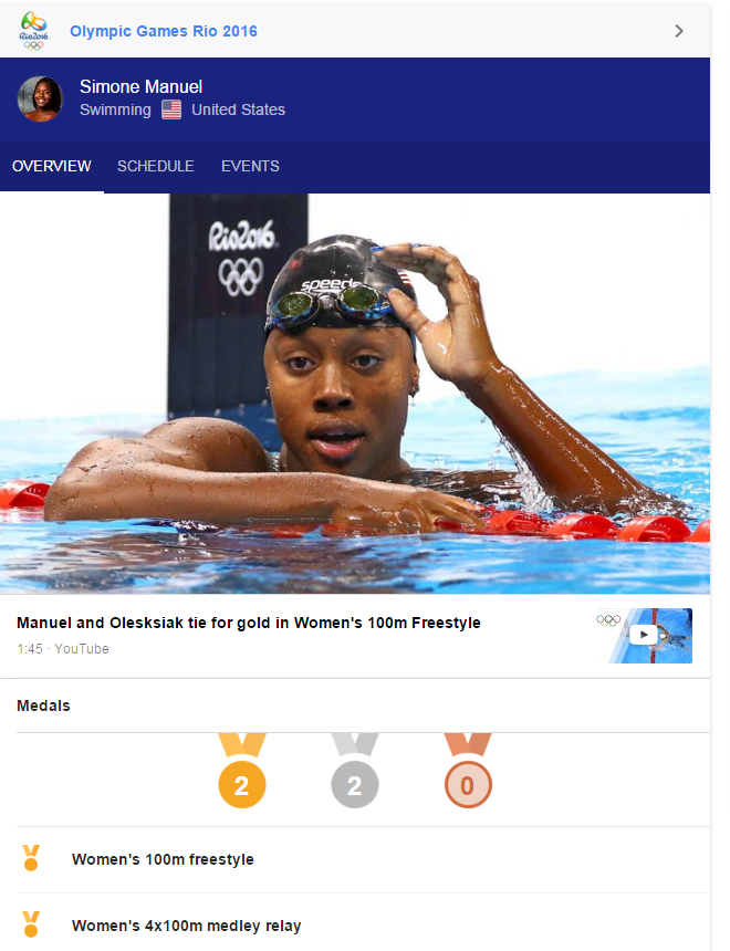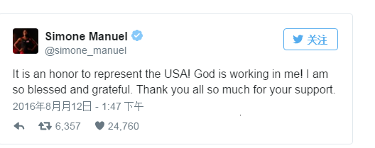 西蒙·曼努埃尔(Simone Manuel) 是少有的黑人游泳运动员。这位来自斯坦福大学的大二学生在获得女子100米自由泳金牌并打破世界纪录后,在推特分享说:“非常荣幸代表美国对参赛。上帝在我里面工作!我如此蒙福,非常感激。”