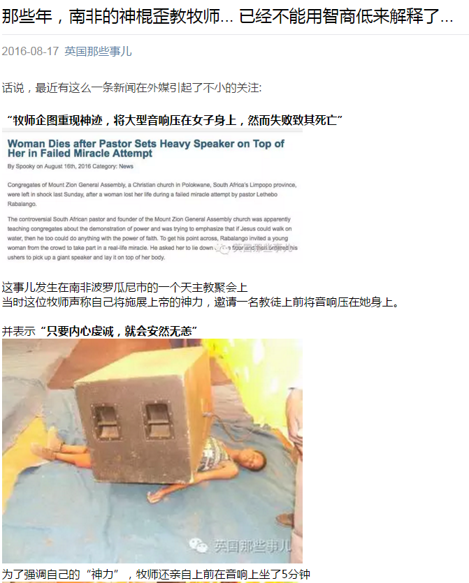 近日一条标题含有“南非的神棍歪教牧师”的帖子(可按此)在网上颇为流传,里面提到最近在外媒引起关注的一则新闻,说的是南非有那么一个牧师企图重现神迹,将一台大型音响压在一位女信徒身上,牧师声称自己要借此施展上帝的“神力”,然而牧师的表演结束后,被重压的女信徒早已晕厥,送到医院不治身亡。但是,牧师却对此轻飘飘地回应道:一定是这个女信徒的内心不够虔诚,信念不够强大。不知事后此牧师有没有被警察部门以涉嫌杀人罪而逮捕法办。此事的荒唐叫人咋舌。