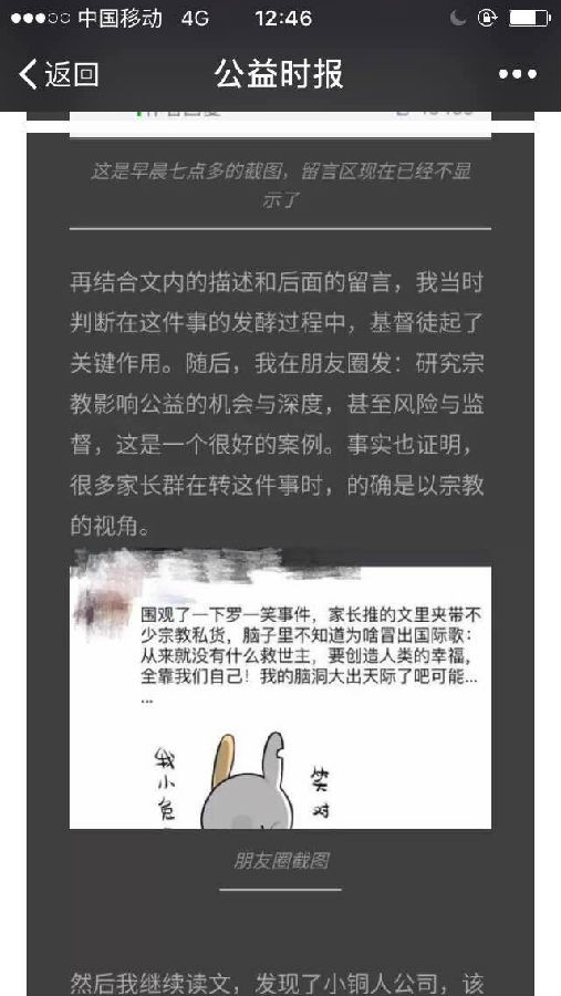 《公益时报》这篇文章整体上来说,算是比较严谨,我也不反对的他观点。但是有一句话,容易引发误会,尤其是宗教敏感人士,文中提到“再结合文内的描述和后面的留言,我当时判断在这件事的发酵过程中,基督徒起了关键作用”