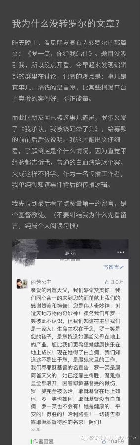 《公益时报》微信公众号11月30日发出一篇《我为什么没转罗尔的文章》,其中一位编辑很好奇这件事情为何火成这样:“因为直觉跟经验都告诉我,普通的白血病筹款个案,火成这样不科学。作为一位传播工作者,我单纯想知道事件背后的传播逻辑”,于是她先看了“点赞量第一的留言,是个基督教徒”,这条评论五天的点赞量超过1万6千多,然后这位编辑又结合文内的描述和后面的留言,“我当时判断在这件事的发酵过程中,基督徒起了关键作用。随后我在朋友圈发:‘研究宗教影响公益的机会与深度,甚至风险与监督,这是一个很好的案例。事实也证明,很多家长群在转这件事时,的确是以宗教的视角。”