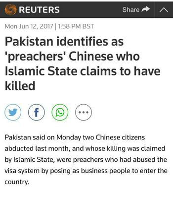 英国路透社6月12日最新消息,巴基斯坦官方本周一最终确认,被IS绑架两名中国人已遇害,两人为以商务签证进入到巴基斯坦的“布道者”(Preacher)。