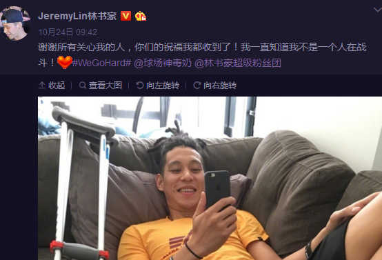 10月21日,林书豪晒出自己手术成功的照片,并感谢所有祝福和帮助他的人。10月24日,他又在微博上分享了自己的照片,说:“谢谢所有关心我的人,你们的祝福我都收到了!我一直知道我不是一个人在战斗!”
