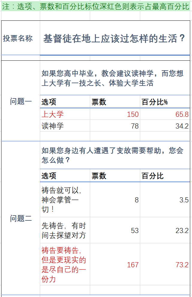 而通过今天的这个小小的调查——虽然它不能代表权威,但是依然可以起到一定的参考作用——可以发现,虽然中国传统教会的基督徒因为许多保守的教导而受到捆绑(字句是叫人死,精益是叫人活),但是当正确的教导、正确的选择来临的时候,基督徒依然能够凭神所赐的良心做出正确的选择。