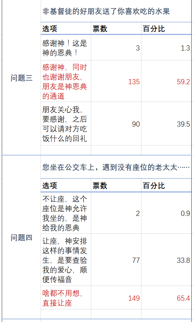 关于如何理解神的恩典和自己所遇到的环境方面的问题中,有149票、约65%的人认为在诸如让座的小事上是不必过分思考(比如我有座位是神的恩典,让座是神安排查验我的爱心),直接行善就可以;而有59%的人认为自己得到他人的馈赠是神的恩典,同时也要感谢这个人——神恩典的通道。由此可见大部分基督徒可以正确理解恩典,并愿意行怜悯之事。