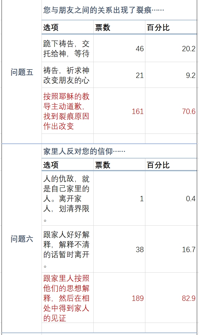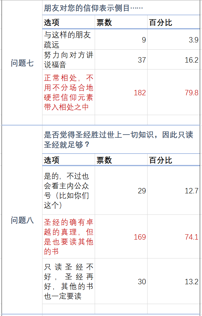 此外,调查还可以看出,愿意践行自己领受的教导的人很多(比如主动道歉求和),基督徒们也更加重视家庭,愿意用行动见证福音,也能够合乎中道地处理事情。此外,还可以看到基督徒普遍认可圣经权威,同时又开始有了广博学习的态度。