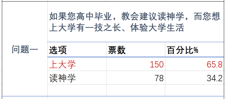 从数据来看,大部分人仍觉得相比读神学,上大学更好,这表明,现在相比以前,教会的思想有了相当的变化,因为在以前的传统教会中,选择上大学会成为一个政治正确的问题。