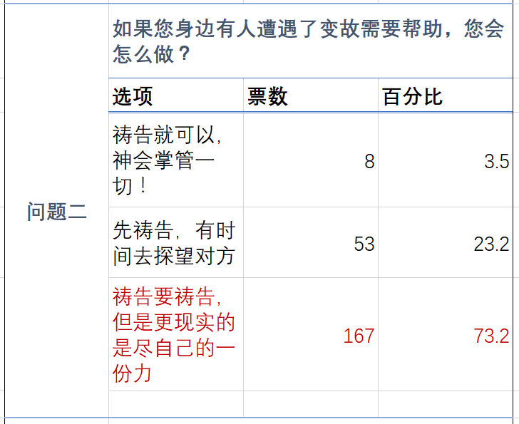 调查结果表明基督徒是愿意在实际行动上做出一些努力,主动帮助别人的占大多数,说明当今的基督徒在信仰表达上越来越贴近于现实,而不是架空于天上,有心无力。基督徒更愿意走进现实里,更愿意走进真实的别人的需要里面,让信仰跟现实产生联系。