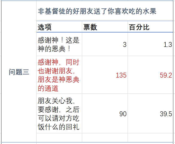 39.5%的人认为“要感谢朋友,并回礼”。首先礼尚往来是应当的,但问题在于这部分人完全按照世俗的人情世故去做,没有看见神的恩典和神赐福在其中,这就是一种世俗化的表现之一。