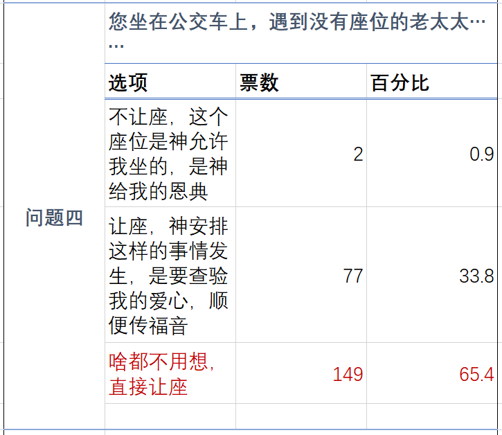 大多数人选择直接让座,这些人的善行是其生命的流露,不需要带任何的目的。可见大部分人对于善行的理解是较为符合圣经教导的。但是问题是,这65.4%的人是啥都不用想,直接让座。也就是说。他们虽然认为我就应该这样做,但是在别人看来,就可能无法看出你是处于什么动机。