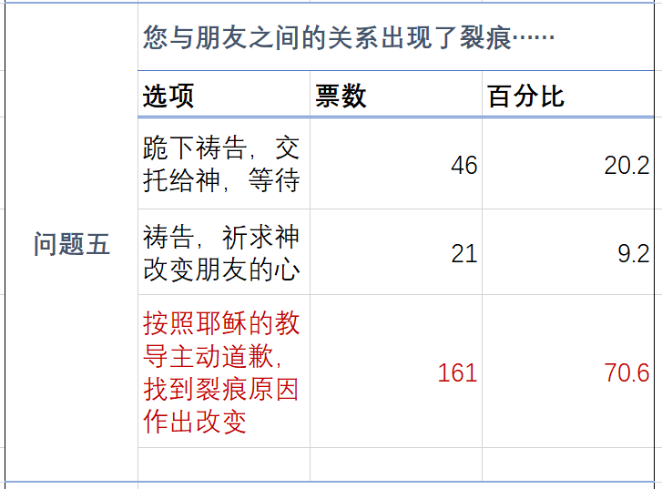 跪下祷告交托给神、然后等待,或者祷告祈求神改变朋友的心,做出这样选择的基督徒加起来将近有三分之一,事实上是认为自己没有错,错在对方,于是等候别人来给自己道歉,等候别人主动作出改变。三分之一还是占少数的。这个乐观的结果是基督教教义所带来的结果。