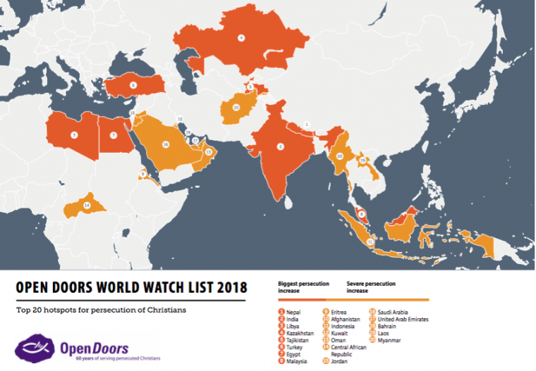 全球基督徒迫害监察组织“敞开的门”(Open Doors,又译“打开大门”)近日公布了2018年"全球守望名单"(World Watch List),列出2018全球前50大基督徒受迫害国家,其中北朝鲜连续十多年来再度被评为“基督徒受迫害最严重的国家”,阿富汗紧跟其后。