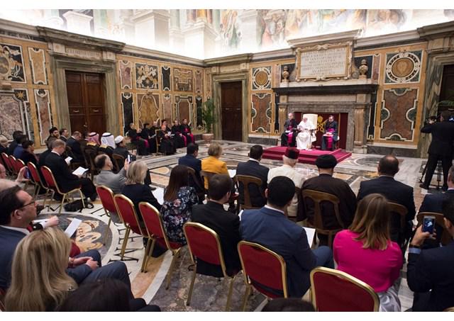 2月2日上午,参加有关“以宗教名义施暴”的研讨会与会者在梵蒂冈克莱孟厅受到教宗方济各接待,教宗谈及会议主题“应对以宗教名义所犯的暴行”说,最大的亵渎是把天主称作自己作恶与犯罪的保证人。