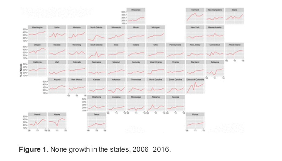 该研究报告说,从1994年起,当宗教右派开始变得更有政治意义时,“无神论者或无宗教信仰的人数”(nones)也开始增长了。报告引用了《联合国会选举研究》(CooperativeCongressional Election Study )所收集到的资料,为每个州都制作了一份非宗教信仰逐人数渐上升的图表,并将其与“已注册的与基督教右派有关的游说团体、同性恋权利游说团体、与宗教左派有关的游说团体”相比较起来,并为这个州是否立法禁止同性婚姻而添加了一个标记。