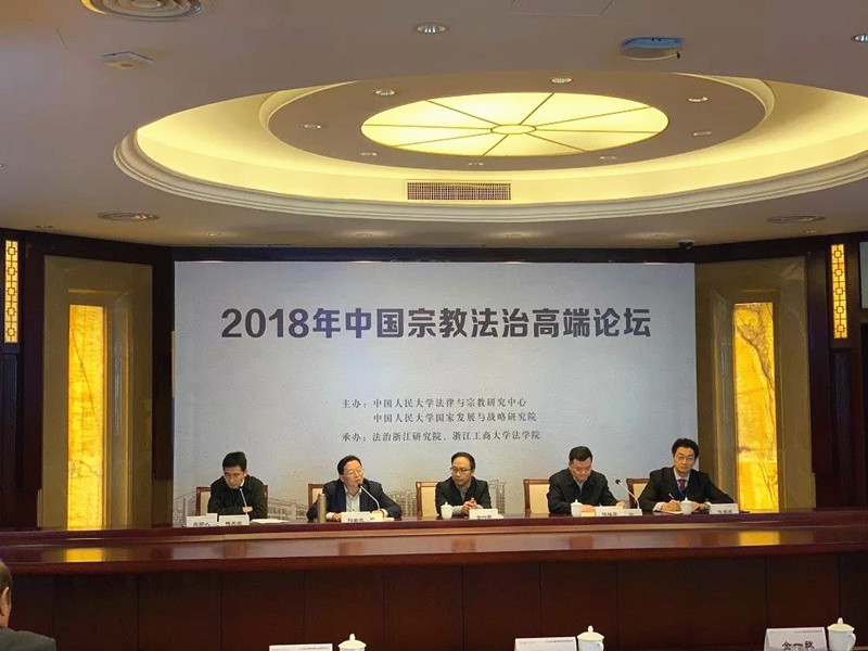 2018年11月24日,“2018年中国宗教法治高端论坛”在杭州举行。论坛由中国人民大学法律与宗教研究中心、中国人民大学国家发展与战略研究院主办,法治浙江研究院、浙江工商大学法学院承办。开幕式由浙江工商大学副校长、法治浙江研究院院长钱天国主持,浙江省民宗委副主任陈振华、浙江工商大学党委书记金一斌、中国人民大学法律与宗教研究中心主任冯玉军教授、《中国宗教》杂志社社长刘金光分别在开幕式上致辞。来自全国各地高校和研究机构的专家学者约100多人参加论坛。