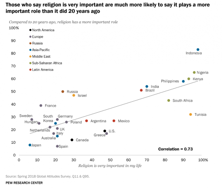 皮尤研究中心表示:“就‘与20年前相比,现在的宗教是否多少发挥了重要作用’这一看法,受调查国家的看法差异很大。”