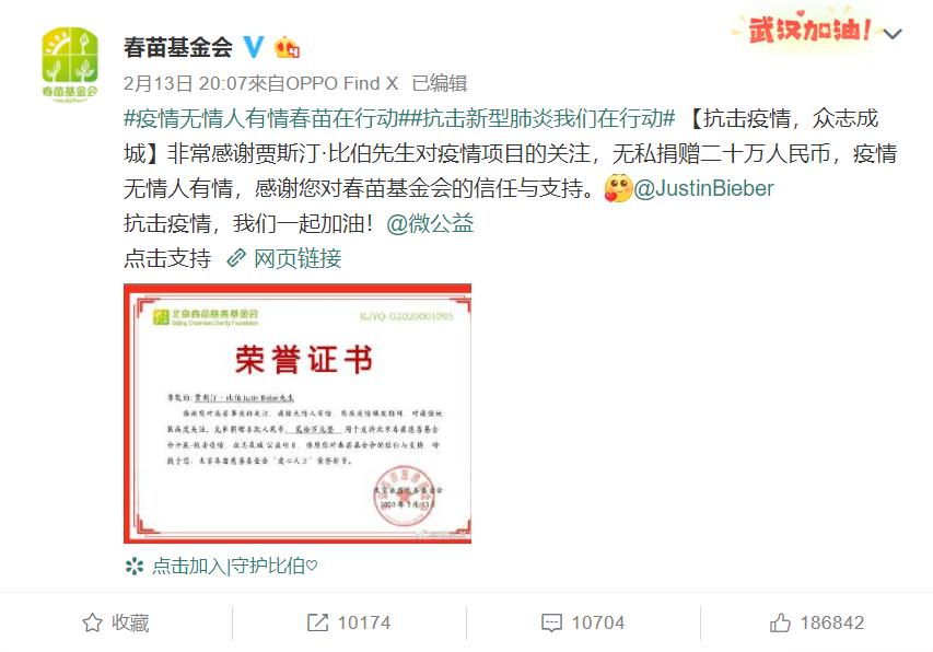 2月13日,春苗基金会在微博上发布说:“【抗击疫情,众志成城】非常感谢贾斯汀·比伯先生对疫情项目的关注,无私捐赠二十万人民币,疫情无情人有情,感谢您对春苗基金会的信任与支持。@JustinBieber 抗击疫情,我们一起加油!”