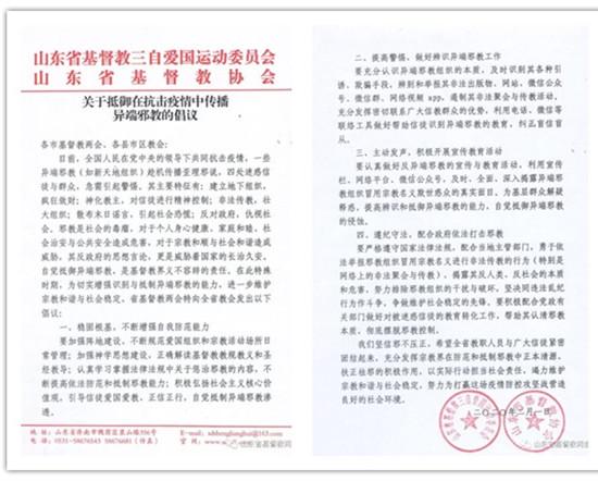 2月初,山东省基督教两会在发布数篇关于预防抗击疫情的通知后,专门发布了“关于抵御在抗击疫情中传播异端邪教的倡议”。倡议文件如下:
