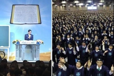 新天地的教主在做什么?说谎,并且教自己的信徒对政府撒谎。在大邱市“新天地教会”,爆发新冠病毒“超级传播事件”后不久。教徒便通过一个内部应用程序,收到了教主李万熙发来的这样一条信息。