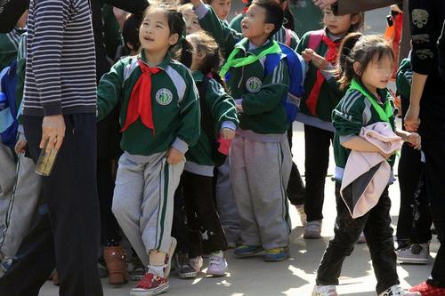 陕西西安未央区第一实验小学为部分学生发放绿领巾,要求这些学生进行佩戴。据该校教师解释称,学习、思想品德表现稍差的学生没有红领巾,所以该校便为这部分学生发放了绿领巾以资激励。但家长并不认可这一做法,指责此举会对孩子心理造成极大创伤。图为10月17日中午放学后,西安未央区第一实验小学门外,一些孩子胸前的绿领巾在人群中显得格外扎眼。
