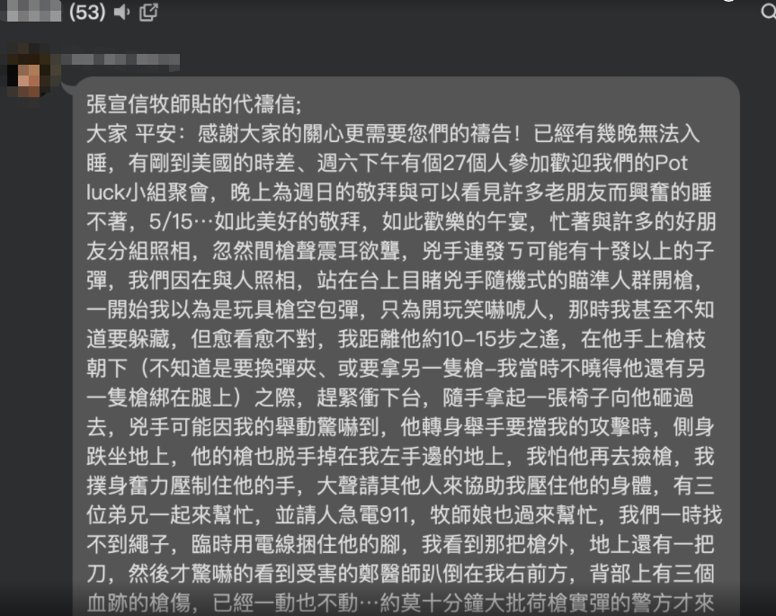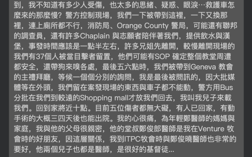 一位华人牧者庄泽锋牧师也发出代祷信,说明了当时的情况并请求大家迫切地为此次枪击案祷告:“求神怜悯教会,在末世动乱中,让我们更多警醒。”