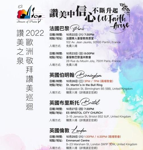 本次2022敬拜赞美巡回欧洲站将会来到法国巴黎(10月22、23日)、英国伯明翰(10月26日)、布里斯托(10月27日)和伦敦(10月29日),其中在巴黎、伯明翰和伦敦将会举行各2场敬拜赞美会。