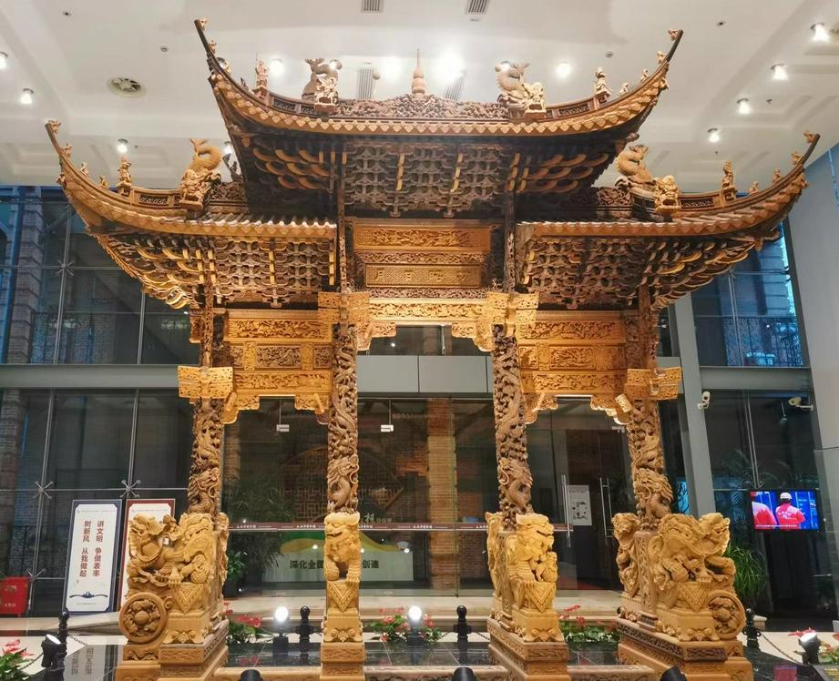 进入土山湾博物馆大厅,一座半旧半新的牌楼矗立在我们的眼前。这就是“镇馆之宝”——与土山湾百塔一起闻名于世的土山湾牌楼。这座牌楼是1912年在外国修士葛承亮的指导下,由上海土山湾孤儿工艺院数十位孤儿雕刻而成,参展过三届世界博览会,后流失海外近百年。2009年4月,这座海外浪迹近百年的牌楼带着累累伤痕得以重归故土,并历经来自浙江东阳的30多位木雕工艺师的精心修复后于2010年6月随着博物馆的开放而对外展出。