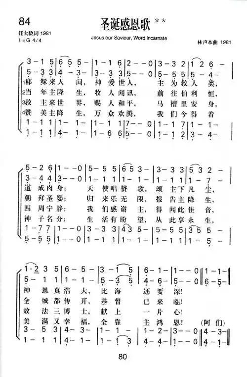 《圣诞感恩歌》出自《赞美诗新编》第八十四首,由任大龄作词、中国基督教圣乐带头人——林声本牧师谱曲。1981年秋,当时《新编赞美诗》已开始征集创作诗歌。圣诗小组的林声本牧师见到了多年从事教会文字工作的任大龄同工(1907—1987),便鼓励他动笔,并提到圣诞节诗歌虽已不少,但内容大多数是歌颂赞美,能倾吐感恩之意的似乎不多。于是商定两人合作创作一首表达感恩主题的赞美诗,由任大龄来作词,林声本牧师来谱曲。经过一段时间,《圣诞感恩歌》创作完成,在经过教堂一段时间的试用以后,又几度在细节上有所调整,受到了信徒的欢迎,并最终形成了现在的《圣诞感恩歌》。