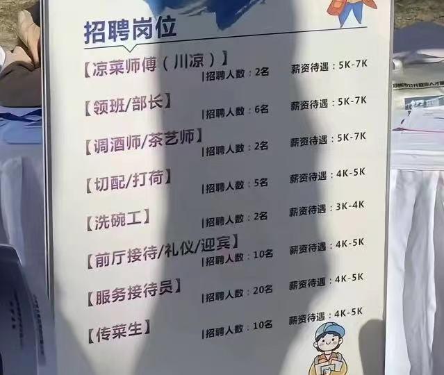 从网络上流传的这场招聘会的相关视频中可看到,有不少餐饮公司、酒店在招聘服务员、凉菜师傅、行李员、洗碗工等职位,比如“服务员”薪资待遇为3000至3999元,“收银员”薪资待遇为2000至2999元……最低薪资仅为2000元。