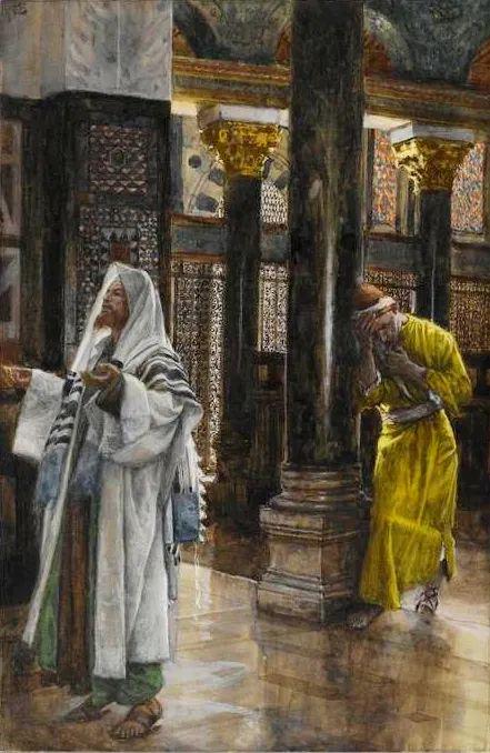 本画来自“法利赛人和税吏祈祷的比喻”(路 18:9-14)。耶稣在描述了自视清高和谦卑悔改两种不同的态度后,总结说,“因为,凡自高的,必降为卑;自卑的,必升为高。”(路 18:9-14)这句教训对今天我们的灵性生活又有何启迪意义?