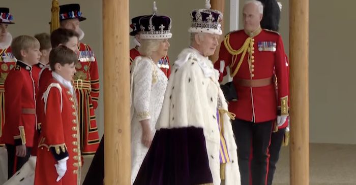 加冕之后,查尔斯三世披上了一件金色长袍,被称为Supertunica。 这件长袍在1911年为了他的曾祖父乔治五世制作。 乔治五世、乔治六世与伊丽莎白二世都曾穿戴。这件长袍重2公斤,由包裹金或银的丝绸织成金绦制作,上头绣有蔓藤花纹和花卉图案。穿在长袍外的是长度及地的“帝国斗篷”(ImperialMantle或Robe Royal),在1821年为了英王乔治四世制作,重量3至4公斤。“帝国斗篷”也由金绬制成,袍上绣有百合花、帝王鹰及红粉玫瑰、蓝蓟与绿三叶草等象征英国的花卉图案。 英女王伊丽莎白二世在1953年的加冕仪式也曾穿上。