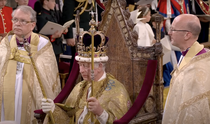 查尔斯三世在加冕仪式上所坐的加冕椅有700多年历史,在1300年英王爱德华一世时期制作,高2公尺,材质为橡木,据信是英国最古老的家具。加冕椅下方放置爱德华一世在1296年从苏格兰带回、象征苏格兰王权的战利品命运之石(Stone ofDestiny)。“命运之石”重150公斤,长66公分、宽42公分、高27公分,被用于苏格兰国王的加冕仪式长达数百年,直到被爱德华一世带回伦敦。