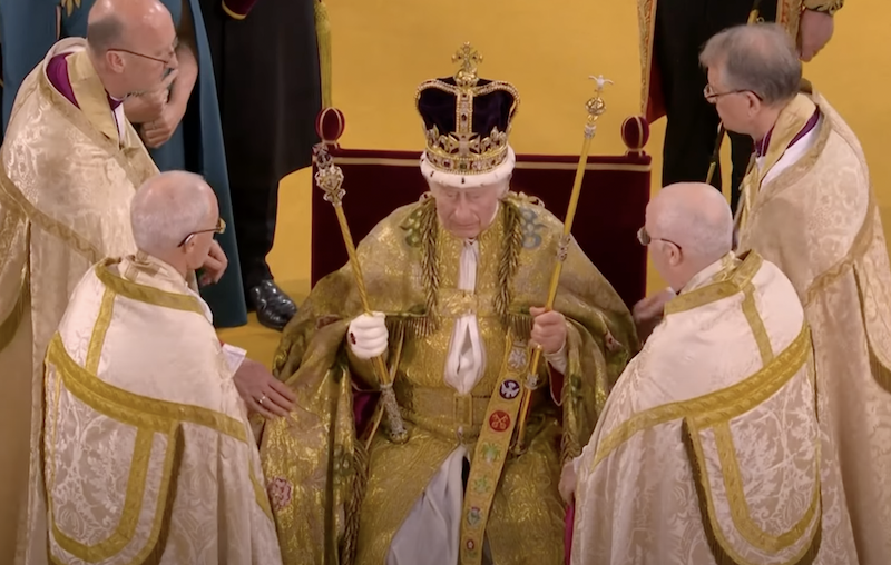 查尔斯三世被加冕为英国和其他14个英联邦国家的君主,同时他也结束了70年的等待成为国王。在包括世界各国领导人、贵族和名人在内的2000多名宾客的见证下,威斯敏斯特教堂内响起了号角声,会众高呼“上帝保佑查尔斯国王”。