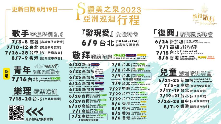 2023年赞美之泉亚洲敬拜赞美巡回所有的行程已经完整地公布了。此次赞美巡回将于6月正式开始,赞美之泉的团队将会到新加坡、马来西亚、台湾和香港等地举办各种各样丰富多彩的活动和敬拜赞美特会。