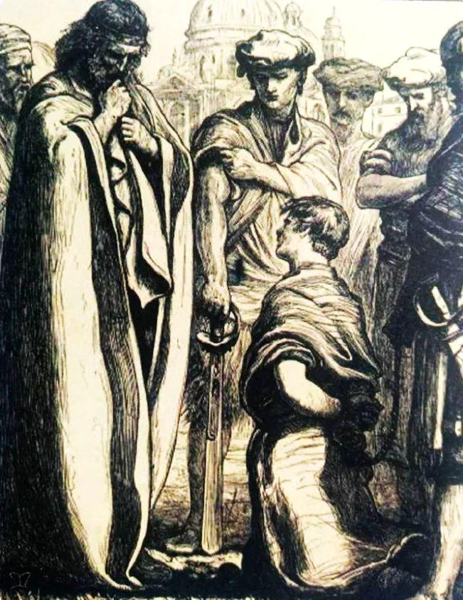 本画背景出自“宽恕之道”的教诲。这个比喻中最重要一点是两个负债者之间的对比。第一个仆人欠他主人一千万银子,一个银子相当于于二百四十英镑。一千万银子等于二百四十万英镑(最新英镑走弱,1英镑兑人民币汇率9.05元)。这是一笔巨额的债务,这就是仆人获得赦免的债。可是,相比之下,他同伴欠他十两银子,还不到五英镑,约为他自己债务的五十万分之一,只是一笔小小的债务,但他穷追不舍(参太18:21-35)。
