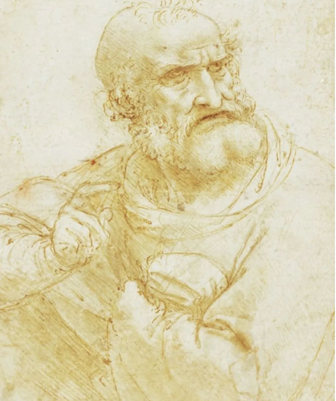(2)彼得:“渔夫”彼得(如上图所示)在画面中的这位老者紧皱双眉,寥寥数笔画出的左手抓着衣服,右侧对着自己看着的方向指指点点,和把整个身体打开的雅各相比,这位老者浑身肌肉紧绷,如果将这位老者的形象转成侧脸,他则成了活脱脱的彼得的形象(如下图所示),位于祂右侧一侧,他的头伸得笔直,左手拨开前面的约翰,目不斜视地看着祂。他的右侧拿着一把渔刀,暗示着他的身份以及刚烈的性格。事实上,据路加记载,当祂真的被抓走的时候,恰恰是彼得奋力反抗,一刀将一位奉命抓捕的士兵的耳朵砍了下来。为了劝阻他的莽撞,祂说了那句名言:“因为凡持剑的,必死在剑下。”(太26:52)