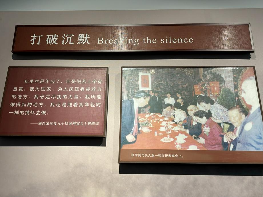 展览的最后一间展室里,第一块展板上印有张学良90岁寿宴的照片,一旁的配文写到:“我虽然是老迈了,但是假若上帝有旨意,我为国家、为人民还有能效力的地方,我必定尽我的力量,我所能做到的地方,我还是照着我年轻时的情怀去做。”