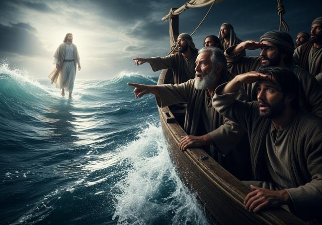 但是,门徒们看到在海上行走的人,他们就害怕了。他们的害怕是面对陌生事物的人性反应,但是这也反映了人性的脆弱,毕竟这些门徒刚刚了经历过五饼二鱼的神迹,现在却把这神迹忘记了。耶稣能用五饼二鱼使五千人吃饱,为什么现在不能在水上行走呢?门徒面对耶稣,同他们面对这未知的大风暴一样,内心充满对未知的恐惧。