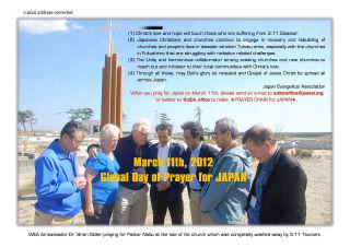 2) 为了日本当地基督徒与教会持续投身在重灾区东北地区(Tohoku)的教会及人们生活的恢复与重建,特别要为福岛(Fukushima)当地教会面对的核辐射挑战而代祷。