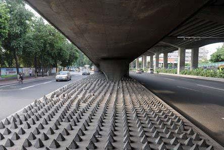 有位网友在微博上说,他发现广州市多个天桥底下浇筑了水泥锥,怀疑是有关部门为了驱赶流浪人员夜晚在此睡觉,想出来的一个办法。从图片上看,这些水泥锥就像一排排的矛尖,别说在上面睡觉,就是从旁边走过,都让人不寒而栗。